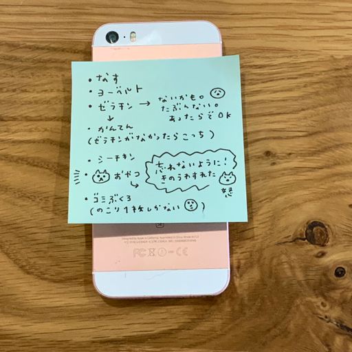 分かっている。このスマホの中に、もっと便利な買い物メモアプリが存在することは。 だが、スーパーの中でちまちま手元のスマホをいじって、棒のように突っ立っていると、元気がありあまって、スーパーボールのように跳ね回るお子さまにとって、危険な障害物に自分がなりうる可能性がある。 なるべくなら他人にとって無害な存在でいたいので、買い物メモは頑固一徹、紙の付箋でやらせてもらっている。 紙付箋は「気がつくと、どっか行ってる」というデメリットがあるのだが、固定位置として常にスマホに貼るようにしたところ、それなりの重量でもって、存在感を示してくれるので、「付箋どこいったー」と全ポケットをひっくり返して泣かずにすむようになりました。